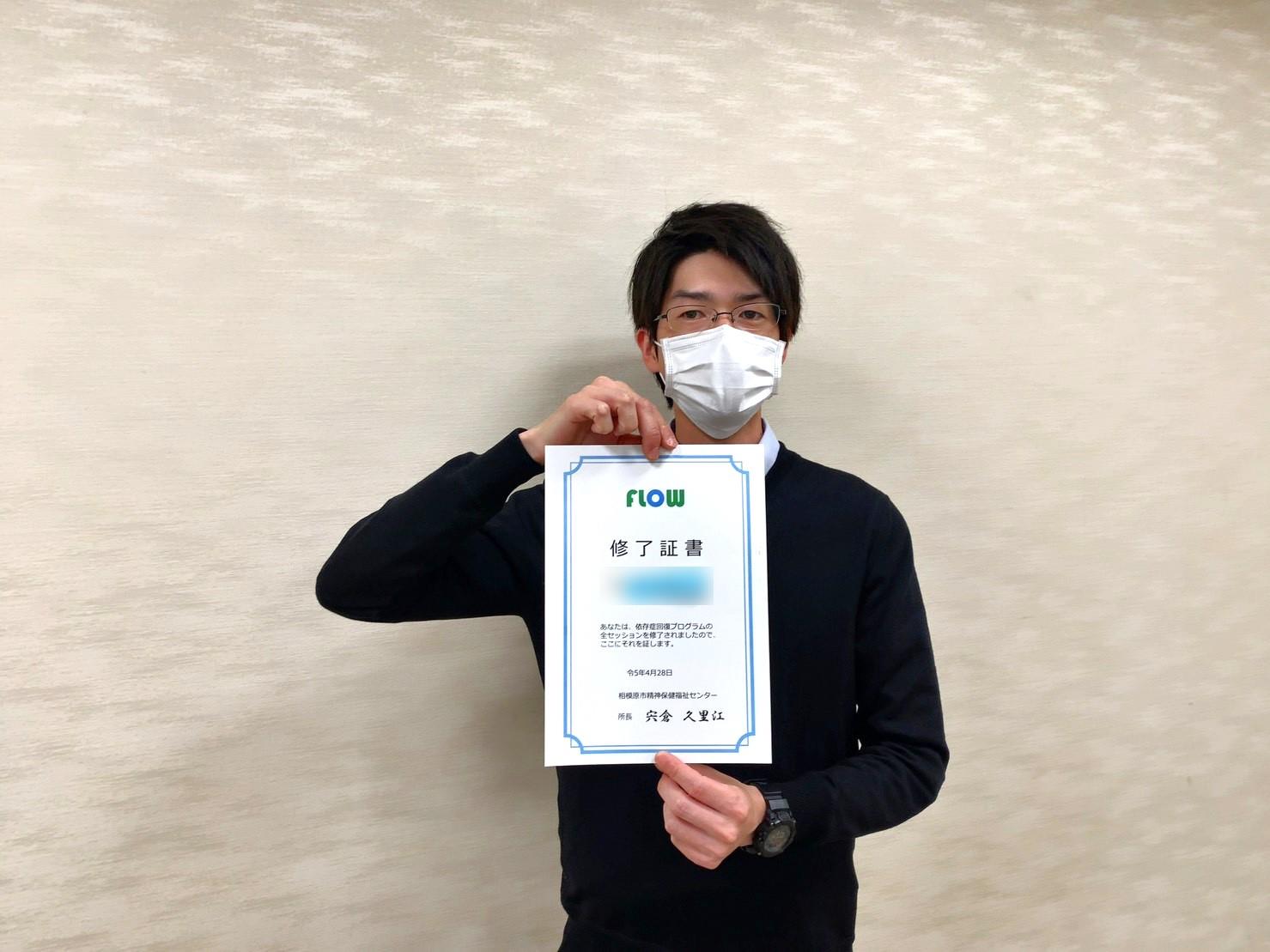 相模原市精神保健福祉センターでの依存症回復プログラム(FLOW)に参加中のスタッフがプログラム修了証を頂きました。