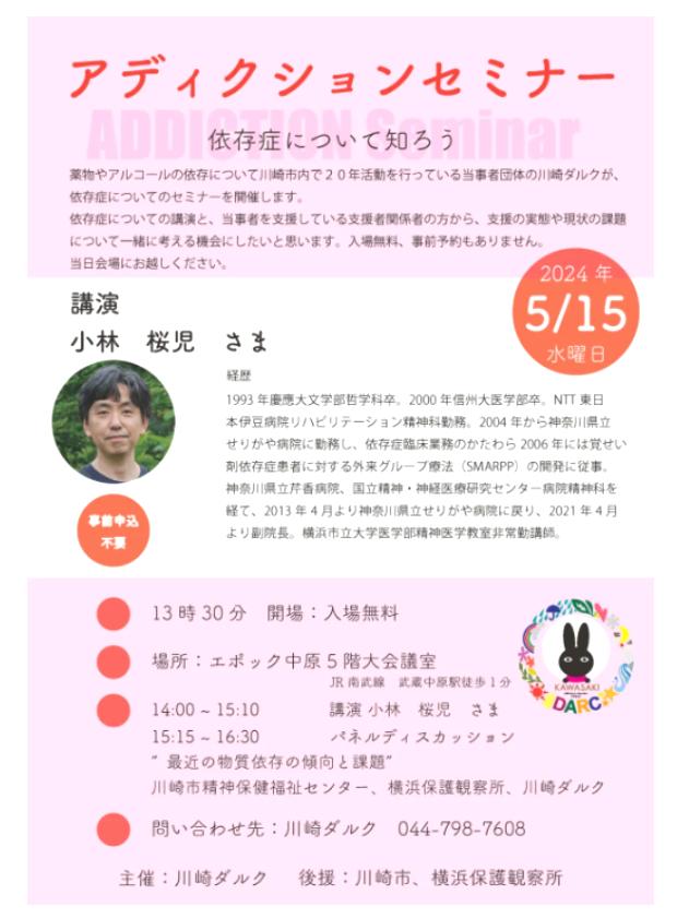 川崎ダルク主催のアディクションセミナーに参加しました。