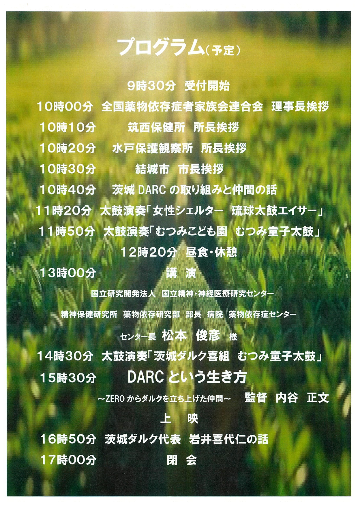 プログラムとしては、和太鼓やエイサー演舞、国立精神・神経医療研究センターの松本俊彦先生による講演、内谷正文監督による「DARCという生き方~ZEROからダルクを立ち上げた仲間~」がありました。