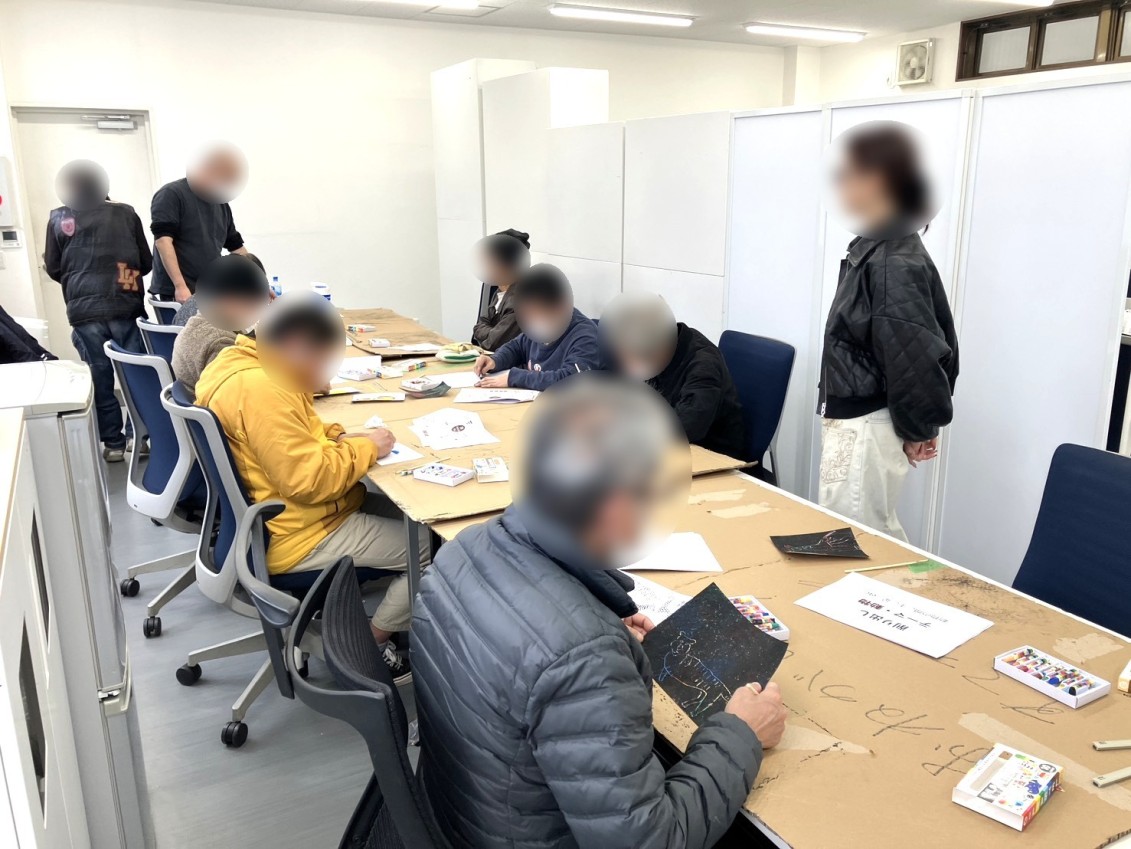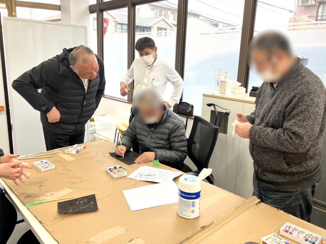 今回のテーマは「削りだし」パステルで色を重ね、その上から黒く塗りつぶし、割りばしや道具で削っていくスクラッチアートに取り組みました。