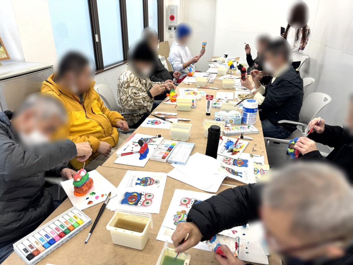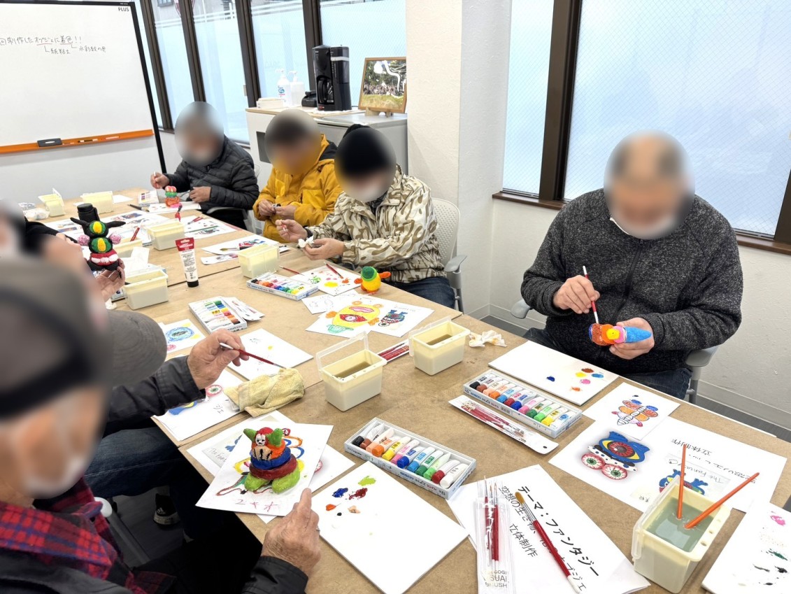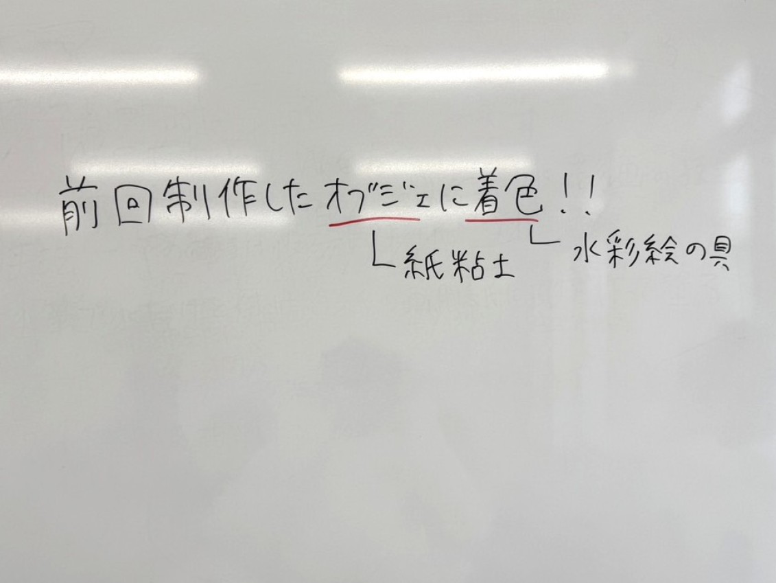 本日のアートセラピープログラムでは、前回制作した紙粘土のオブジェに「着色」を行いました。